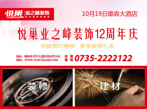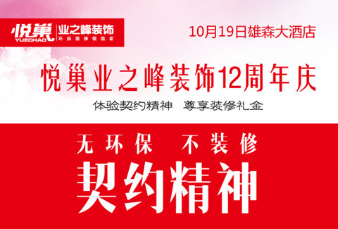 【10月19日】,由悦巢业之峰主办,数十家一线品牌材料商承办的【悦巢业之峰十二周年庆】,从设计、主材、到施工材料一次性购买。厂家直供冰点价!现场设计师材质把控与匹配、材料管家全程陪同透明选材。成为您今秋不容错过的【装修盛会】。